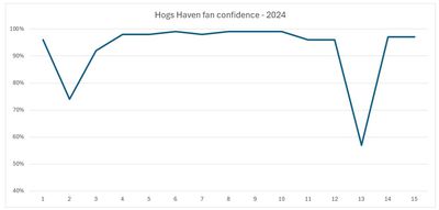As you can see from the chart below, confidence has been high all season, dipping below 92% on only two occasions: following the loss to Tampa Bay in Week 1 and following the loss to the Cowboys in Week 12.
