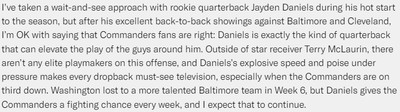 Daniels had another solid outing Sunday against the Baltimore Ravens—269 passing yards, two scores and a passer rating north of 110. But Washington’s defense was gashed for 484 yards and 30 points, and those defensive deficiencies proved too much to overcome.
