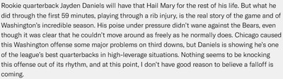 “Daniels can do it all. He can lead the NFL in completion percentage. He can lead all rookies in rushing yardage. He can overcome a rib injury and lead his team to victory even if it requires a miraculous Hail Mary to do so.