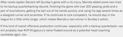 Here’s something neat: If you lower the bar to a 40-rep minimum, the two best quarterbacks in the NFL in terms of advanced statistics (a composite of Expected Points Added and Completion Percentage Over Expectation) are Jayden Daniels and Marcus Mariota. Mariota has the benefit of whipping the Carolina Panthers, of course, but the bottom line is that Kliff Kingsbury is cooking right now. Some inside the industry believe he could throttle himself right back into a head coaching seat after this year if the pace holds. Last week: 6