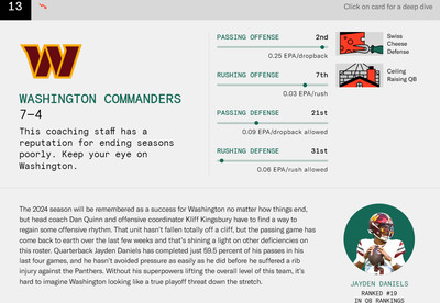 “Washington has averaged only 253 yards in those two games on just 4.1 yards per play while converting 30.8 percent of their third downs. The biggest indicator of their struggles is the rushing yards quarterback Jayden Daniels has totaled over the last two games—only 23.