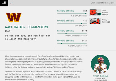 The Commanders defense forced three fumbles (recovering two) and shut down Tony Pollard and the rushing attack. This was a pretty easy win for the Commanders, who moved to 8-5 on the year and are hungry for a playoff berth. Last week: 11