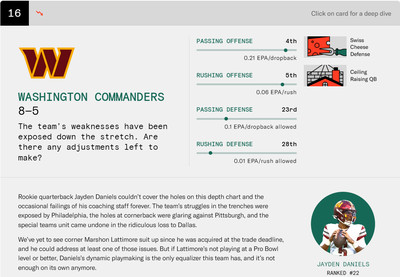 The Commanders are looking better for locking down a wild-card berth after beating the Titans before the Week 14 bye. Their schedule sets them up well the rest of the way beyond a Week 16 home rematch with the Eagles. Last week: 10
