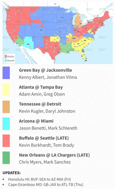 The Washington Commanders host the Chicago Bears at 4:25 pm. There are a few good games to watch in the early afternoon block. Fox has four games, and the Green Bay Packers vs Jacksonville Jaguars game will be seen in most of the midwest. We get a division game between the Atlanta Falcons and the banged up Tampa Bay Buccaneers. The red-hot Detroit Lions host the Tennessee Titans, and Tua Tagovailoa makes his return from concussion against the Arizona Cardinals.