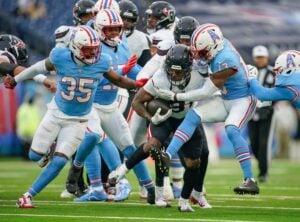 Houston Texans running back Dameon Pierce (31) is stopped by Tennessee Titans cornerback Chidobe Awuzie (13) during the third quarter at Nissan Stadium in Nashville, Tenn., Sunday, Jan. 5, 2025.