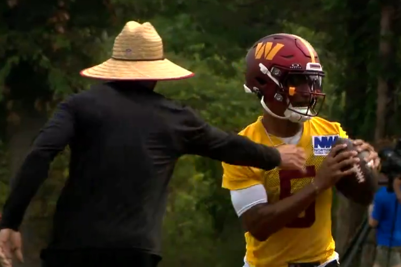 Day two, first Commander to the practice field is … *drumroll* … Jayden Daniels and Sam Hartman pic.twitter.com/eHlsC5Hfpd