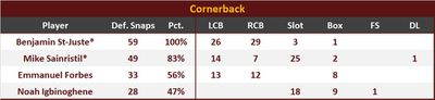 Emmanuel Forbes returned for his first game following thumb surgery and played predominantly at boundary CB. Forbes was targeted 3 times in 14 coverage snaps (21%), and he allowed 2 receptions to WR Michael Wilson for 16 yds. Forbes made 2 tackle assists and missed 3 tackles.