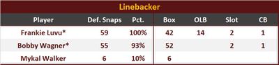 Bobby Wagner was second on the team, after Dorance Armstrong, with 3 defensive stops. He had 5 solo tackles and 5 assists, with 3 TFLs. He was also second on the team at pressuring the QB, with 3 total pressures and 0.5 sack. According to PFF, he had one target in coverage against Marvin Harrison Jr for no reception.