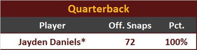 The Cardinals’ rookie star WR Marvin Harrison Jr. had the second worst receiving day of his young career matched up against the Commanders’ secondary, who limited him to 5/6 receptions for 45 yds and 1 TD. He had the second lowest receiving productivity of his rookie campaign, at just 1.61 Y/RR. The Commanders held the rest of the Cardinals’ receivers to under 40 yards. OK, so maybe they gave up the Cardinals’ highest receiving total of the season. At least they held them to under 235 yds.