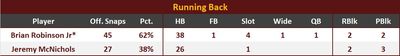 Brian Robinson had a solid outing, picking up 101 yards and 1 TD, and 6 first downs on 21 rushing attempts (4.8 YPA), with a rushing success rate of 57.1%. Robinson averaged 3.0 yards after contact per attempt. He also caught all 3 of his passing targets for 12 yards. PFF ranked Robinson 4th on the team in overall blocking with a grade of 78.0 on only 4 blocking snaps.