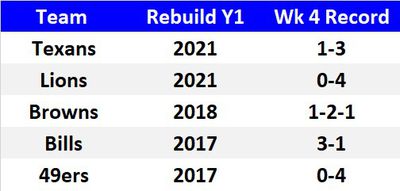 Of the five teams, only the Bills matched the pace of the Commanders’ rebound. The 2021 Texans did not record their 4th win until Week 16. The 2021 Lions ended the season 3-13-1. The 2018 Browns notched their 4th win in Week 12. And the 2017 49ers had to wait until Week 15.