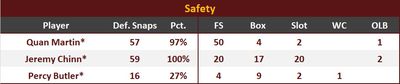 Quan Martin once again played FS for most of the game. He made 3 tackles and had 2 assists, with 1 defensive stop. Martin had 1 target in coverage against slot WR Greg Dortch and conceded a 9 yd reception.
