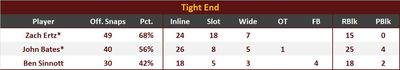 John Bates served mainly as a blocker, but did catch his only target for 9 yds. Bates scored poorly as a blocker by PFF’s grading system (Run 50.5, Pass 54.6). PFF charged him with 1 QB hurry in pass protection (25% pressure rate).