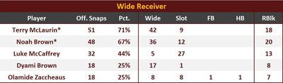 Noah Brown was third on the team with 3/4 receptions for 26 yds and 2 first downs. Dyami Brown and Luke McCaffrey each chipped in 1 reception on 1 target. Luke’s went for 17 yds and Dyami’s was a contested catch.