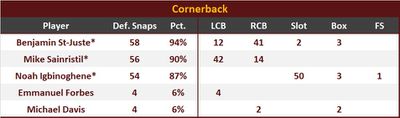 Benjamin St-Juste’s role has remained constant as CB1, while the Commanders have experimented with different players at CB2 and in the slot. This week Mike Sainristil lined up opposite from BSJ, while Noah Igbinoghene worked the slot. Emmanuel Forbes’ return from injury was brief and Michael Davis reappeared for 4 snaps.