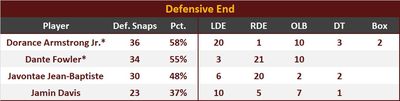 Rookie Javontae Jean-Baptiste played nearly equal snaps at RDE to Fowler, but did not record a pressure. He made 1 TFL and 1 assist.