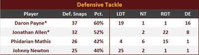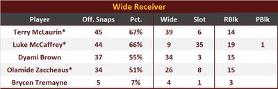 Kliff Kingsbury used his WRs in very conventional alignments this week, with Terry McLaurin lining up as the left wide out for much of the game, and Dyami Brown and Olamide Zaccheaus platooning on the right side. Luke McCaffrey was once again the primary slot receiver. This is the first game of the season without a WR taking snaps in the backfield.