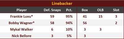 Not content to let Luvu have all the fun, Bobby Wagner generated 4 total pressures including 2 sacks on 10 blitzes (40% pressure rate), while also making 2 tackles, 2 assists and 1 forced fumble, for a total of 3 defensive stops. In 30 coverage snaps, he allowed 4 targets and receptions for 20 yds and 1 TD, while limiting his receivers to 0.67 yds/coverage snap.