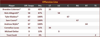 Brandon Coleman was listed as the starting LT for the first time, but actually ended up taking 1 fewer snap than Cornelius Lucas, as the two continued to play on alternate possessions. Michael Deiter spelled Nick Allegretti at LG for 9 snaps, and Trent Scott took the field in max protect alignments.