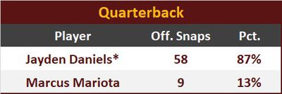 After his record setting performances in previous weeks, against the Browns Jayden Daniels only completed 14 of 25 passes (56%). That was the first time in five games he has completed fewer than 70% of his passes. Even so, he threw for 238 yds (9.5 YPA) with 1 TD and 1 INT, while taking 2 sacks and facing the most pressures to date (16).