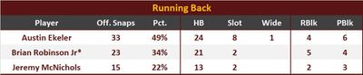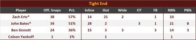 John Bates and Ben Sinnott earned their keep as blockers. Bates took 3 snaps lined up at RT in 12- and 13- personnel sets. The TEs also combined for a total of 5 snaps lined up at fullback.