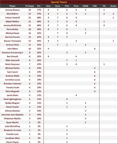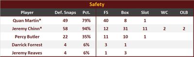 This week, Darrick Forrest finally made an appearance on defense, for just 4 snaps. It was also Jeremy Reaves’ second appearance, other than on special teams.