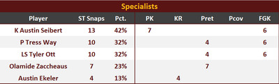 Tress Way punted 4 times, doubling his season total, while averaging 48 yds/punt, with a long of 53 yds and a net average of 36.5 yds.