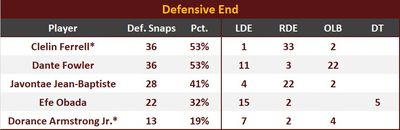 Dorance Armstrong left the game early with a rib injury. He was replaced at Left DE by a platoon of Efe Obada and Dante Fowler.