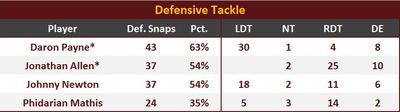 Daron Payne generated 3 QB hurries on 22 pass rush snaps, and led the DTs with a pressure rate of 13.6%. He recorded no other defensive stats.