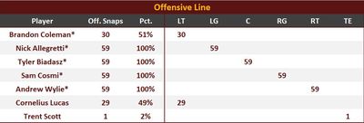 - LT Brandon Coleman: 3 pressures (1 sack)/24 snaps = 12.5%