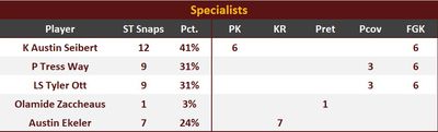 Tress Way was back in form, with 3 punts for 123 yards, and an average net yardage of 40.0 yds/punt. He landed 2/3 punts well inside the 20 yard line.
