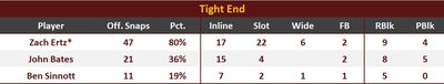 After a slow week against the Browns, Zach Ertz was back to being Jayden Daniels’ most reliable chain mover, catching 4/4 targets for 68 yds and 4 first downs. He was the second most productive receiver at 2.06 Y/RR. Ertz was the only TE targeted as a receiver.