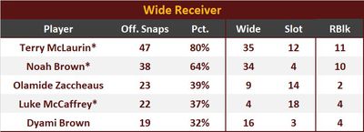 Noah Brown led the WR group in yardage production, catching 4/8 targets for 58 yards and 3 first downs. He also led all Commanders receivers in productivity, at 2.15 Yards/Route Run.