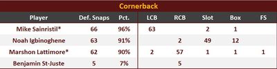 Mike Sainristil had a headline performance in pass defense, featuring 2 interceptions with 22 return yards, and 2 pass breakups. He was targeted 5 times in coverage and allowed 2 receptions (40% rec) for 40 yds to WR Khalif Raymond (1/1 rec, 13 yds) and WR Jameson Williams (1/3 rec, 19 yds). Sainristil was highly effective in coverage, allowing just 0.89 receiving yards/coverage snap. Sainristil also made 4 tackles with 1 assist and 1 missed tackle.