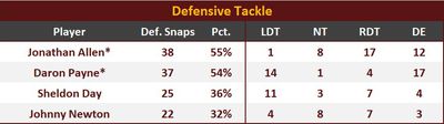 Jonathan Allen came through with his best game since early in the season, posting 1 tackle for a defensive stop, 2 QB hits and 5 hurries. He led the team in total pressures (7) and pressure rate (29.2%). That is an extremely high pressure rate for an interior defensive lineman.