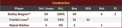 Bobby Wagner contributed 2 tackles and 6 assists, with 1 missed tackle. According to PFF, Wagner was targeted 7 times in coverage, giving up 4 receptions (57.1%) for 46 yds. His receiver matchups were: Amon-Ra St. Brown (2/3 rec, 47 yds), Jahmyr Gibbs (3/4 rec, 46 yds), Tim Patrick (0/1 rec). PFF gave him a 77.1 passer rating in coverage; Pro Football Reference had him at 94.3. Suggestions that he was a liability in coverage at the LB position seem unwarranted.