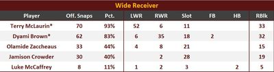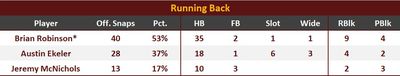 Brian Robinson bounced back from a miserable couple of games with a strong performance against the Lions. He rushed 15 times for 77 yds (5.1 Y/A), 2 first downs and 2 TDs. His 73.3% rushing success rate was the second-highest of any player in the divisional round (min 5 att) after Kareem Hunt (87.5%, 8 att). He was not targeted as a receiver.