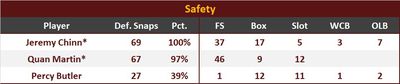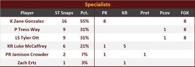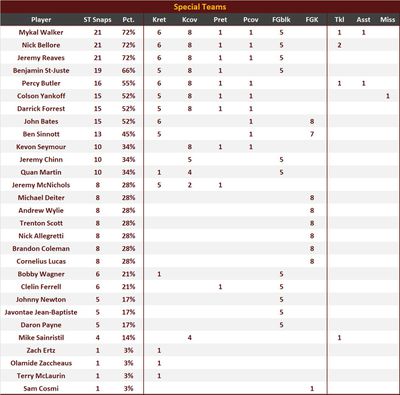 Mykal Walker and Percy Butler each made 1 tackle and 1 assist. Colson Yankoff had 1 missed tackle. Butler and Jeremy Chinn tied with 6 others for the 12th most teams coverage tackles at 9 apiece.