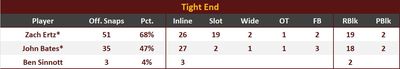In Detroit, Zach Ertz caught 5/5 targets for 28 yds and 1 TD. John Bates caught 1 of 2 passes thrown his way for a 20 yd gain.