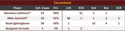 In stark contrast to the other CBs, Benjamin St-Juste took the field for only 3 defensive snaps, and somehow managed to get called for a 5 yd illegal contact penalty, with the Saints at 3rd and 10 at their 26 yard line in the fourth quarter. The penalty gave them a first down to keep a drive alive that ended in a field goal.