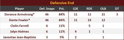 Dorance Armstrong made his presence felt with 3 tackles, 1 assist, 1 sack, and 2 TFL, for a total of 3 defensive stops. According to PFF, he generated pressure on just 5.9% of pass rush snaps, but he made it count with the sack.
