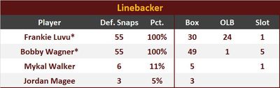 Bobby Wagner had 3 solo tackles and 2 assists, with 1 TFL and 1 missed tackle. He made a total of 2 defensive stops. On just 5 pass rush attempts, he registered 1 QB hit and 1 hurry. He was targeted 3 times in coverage, allowing 2 receptions for 24 yds.