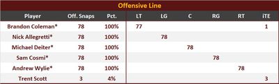 - LT Brandon Coleman: 1 hurry, 1 sack, pressure rate 4.08%