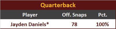 While the pass protection wasn’t as good as the last game, it wasn’t a disaster either, with two of the OL keeping the Saints’ pass rushers completely at bay. Only one of Jayden Daniels’ 8 sacks was credited to a missed block by an offensive lineman. Once again, the rookie was to blame: