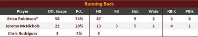 Despite pleas for more carries from some HH writers, Chris Rodriguez only took one handoff for 2 yds and was hit at the line (0 YBC), but pushed forward for 2 YAC.