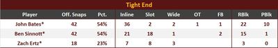John Bates and Ben Sinnott continued to play primarily as blockers. Bates caught his lone target for a 6 yd first down. Sinnott was also targeted once for a 6 yd reception.