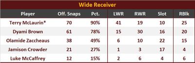 Dyami Brown was a close third with 3/4 receptions for 30 yds. He had an ADOT of 1.0 yds and averaged 9.0 YAC/reception.