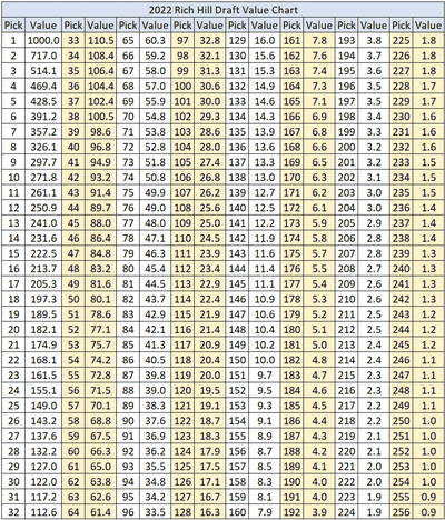 The Falcons have 7 picks in the 2024 draft (two 4th rounders; no 7th rounder). The point differential between 2nd overall and 8th overall according to Rich Hill is 390 points, roughly equivalent to the 6th overall pick.