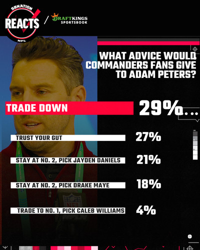 Another way to look at the survey results is that 66% of respondents — 2 out of 3 — voted to stay at #2 and use the pick on a quarterback, with some preferring Drake Maye, others preferring Jayden Daniels, and even more willing to simply trust Adam Peters to get it right.