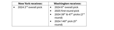 Assuming, however, that Joe Schoen was willing to make this deal, then Washington would be in a position, at 6th overall, to draft a top-tier offensive lineman (or even trade down again). The Commanders would also add a pair of top-50 picks in this year’s draft, and Adam Peters would go into the 2025 draft with a pair of first round picks that again are likely to both be in the top half of the round, providing tons of flexibility for next year.